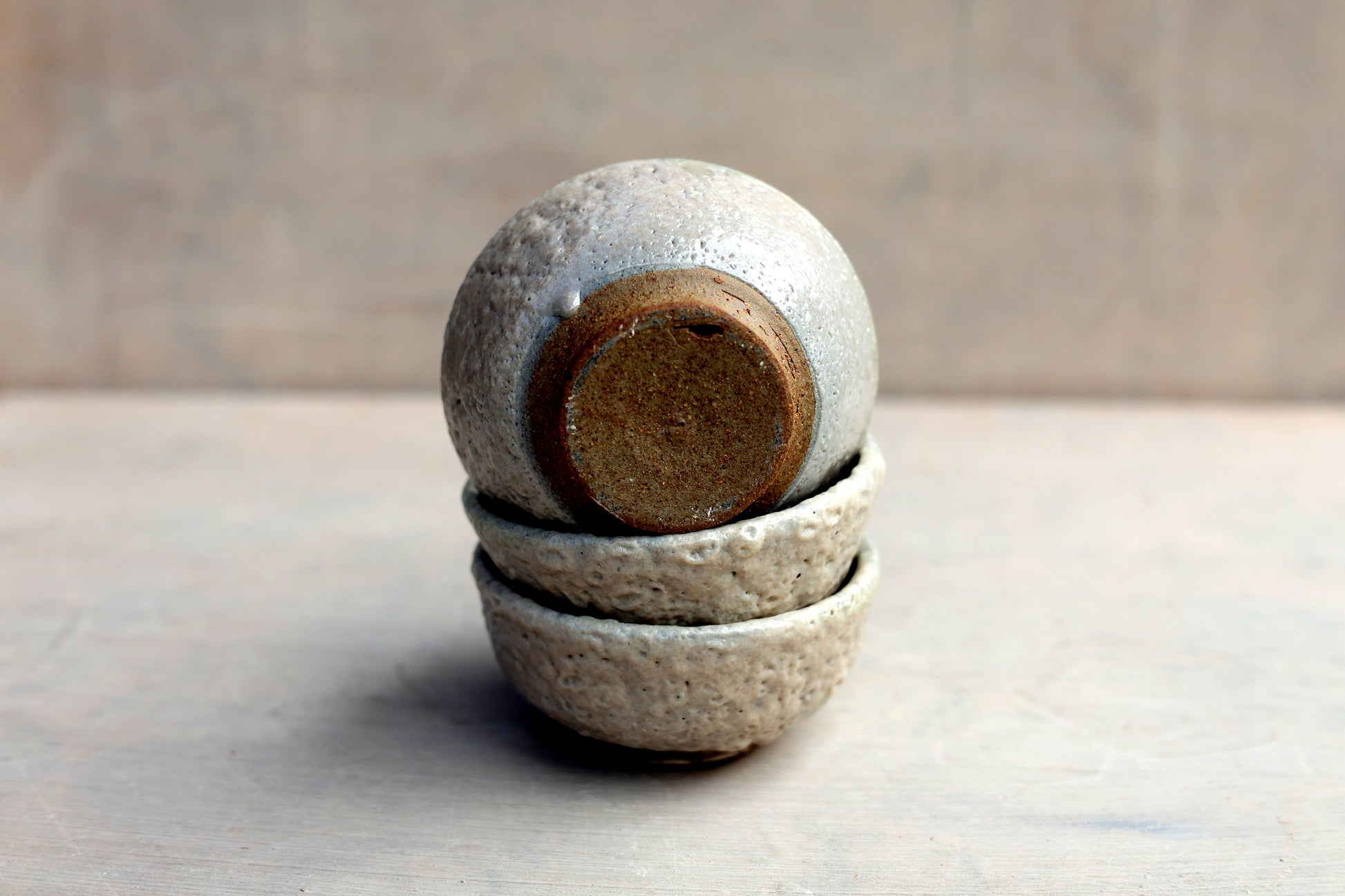 Émail transparent à l’intérieur pour un usage quotidien, et à l’extérieur un shino appliqué au pinceau, laissant apparaître la chaleur de la terre et les variations naturelles de la cuisson au gaz.