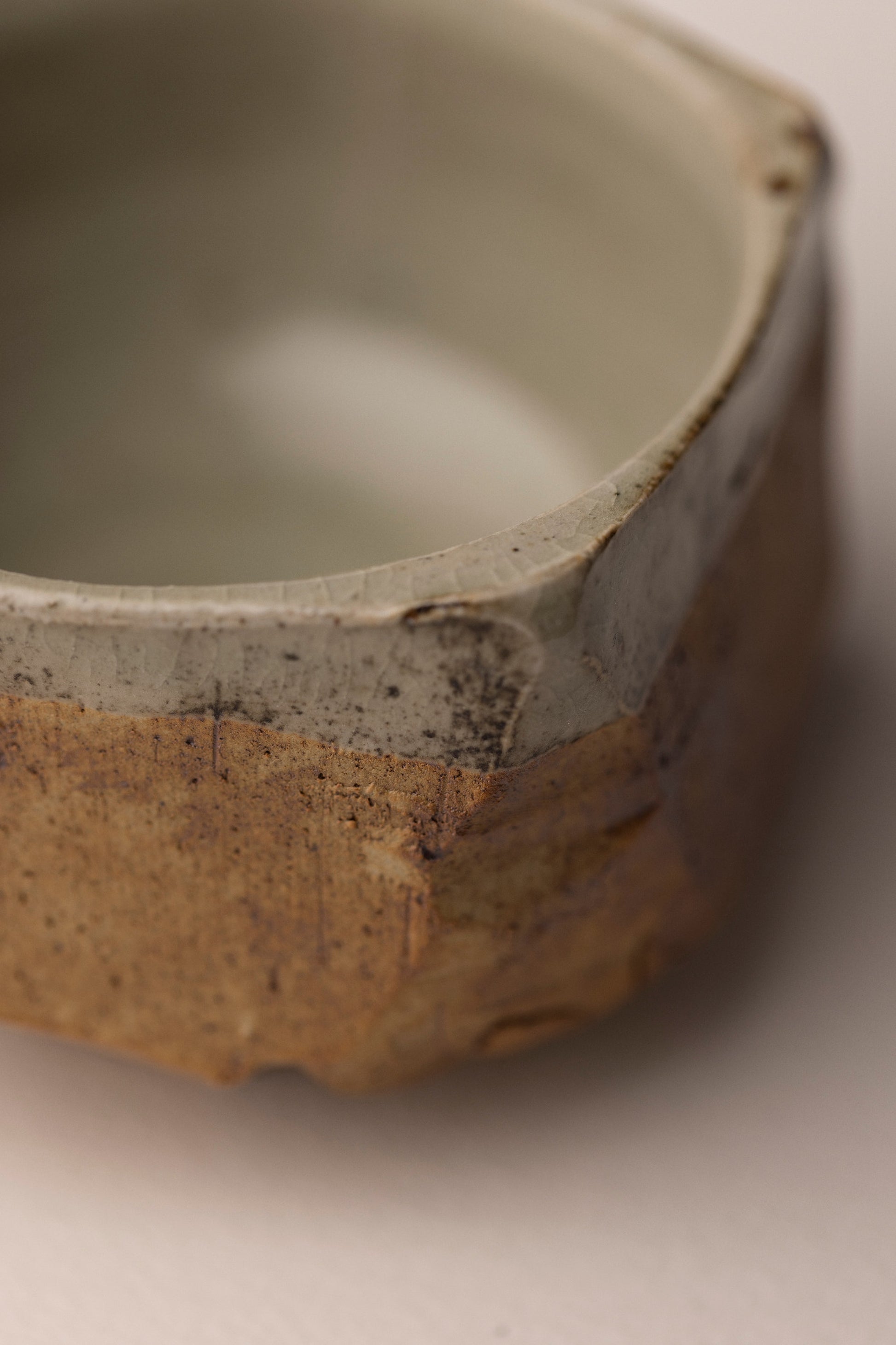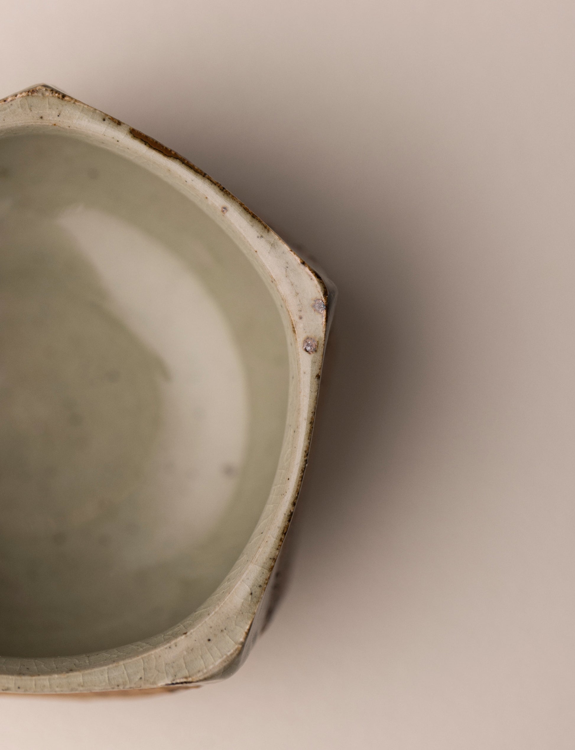 Bol à matcha inspiré de la tradition japonaise, revisité par la forme pentagonale Kakukei. En grès, cuisson gaz en réduction, intérieur entièrement vitrifié. Convient aussi comme bol de table.