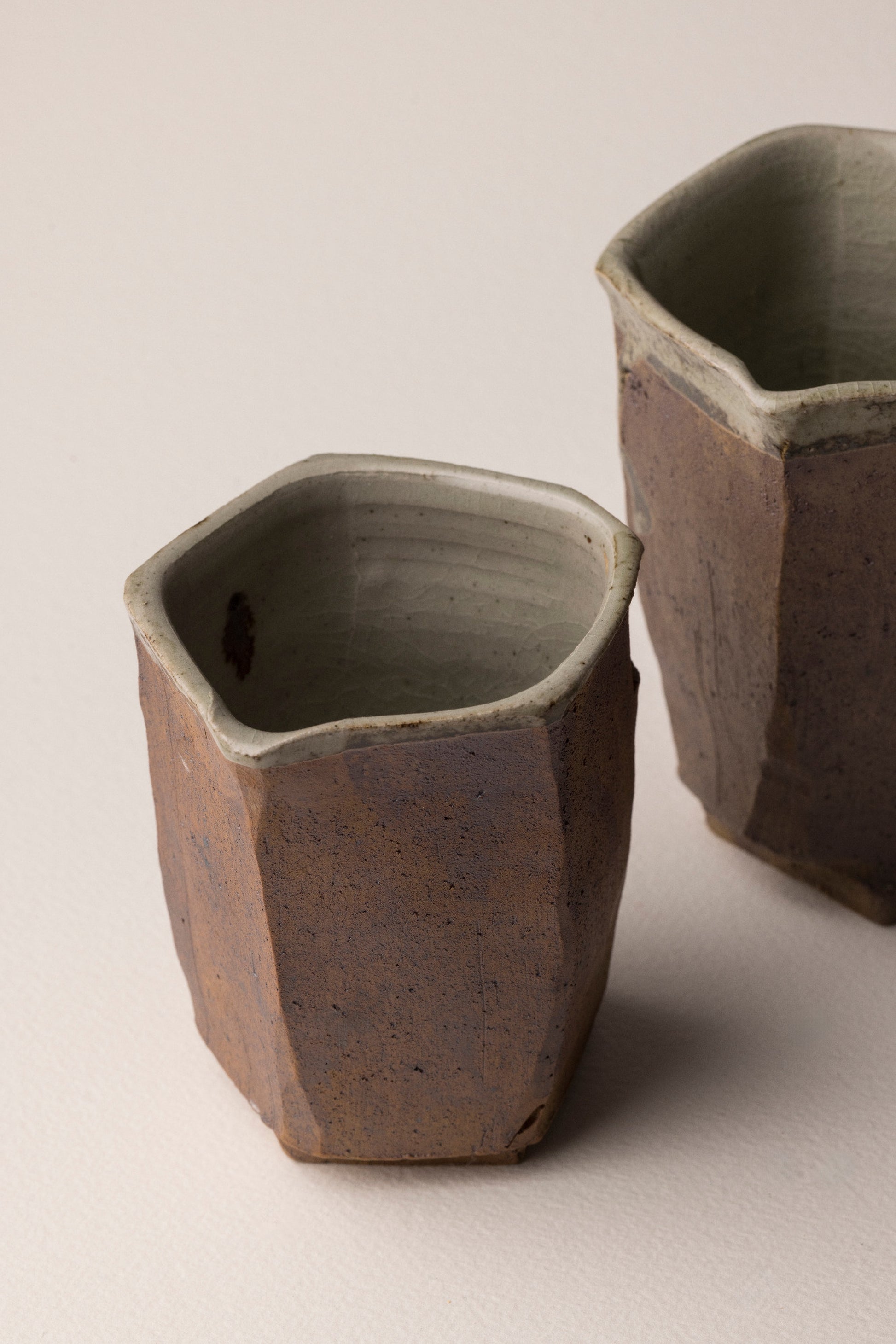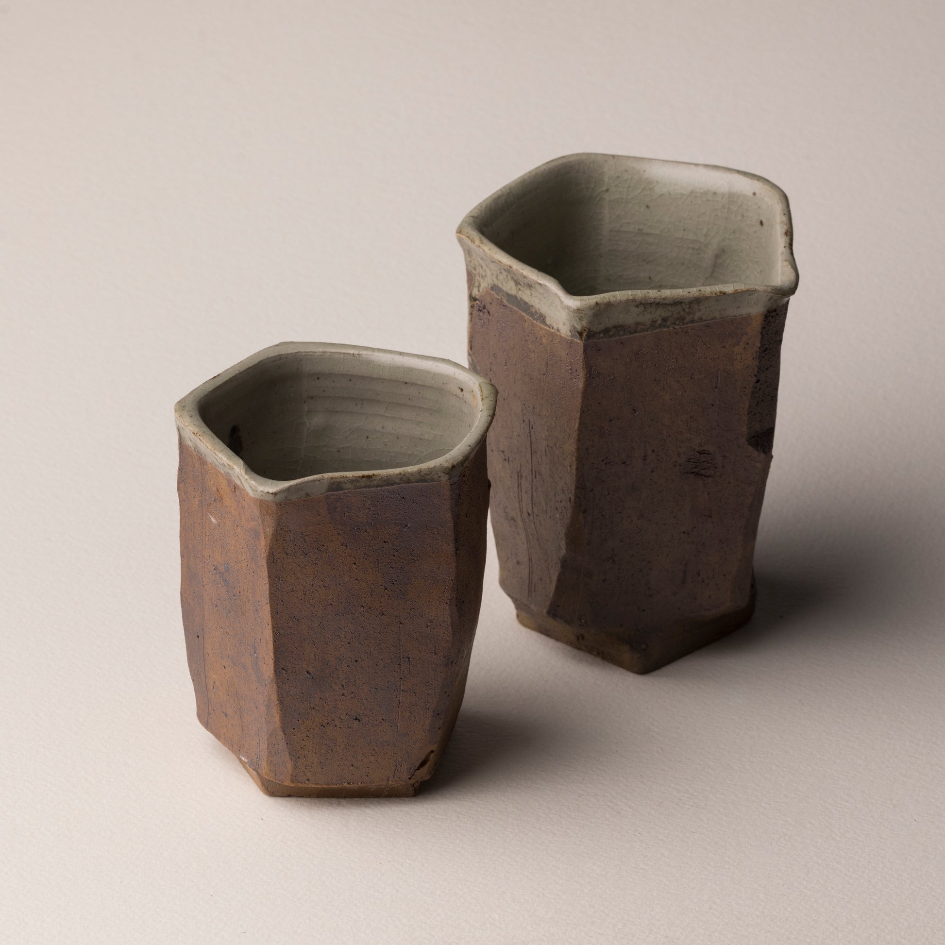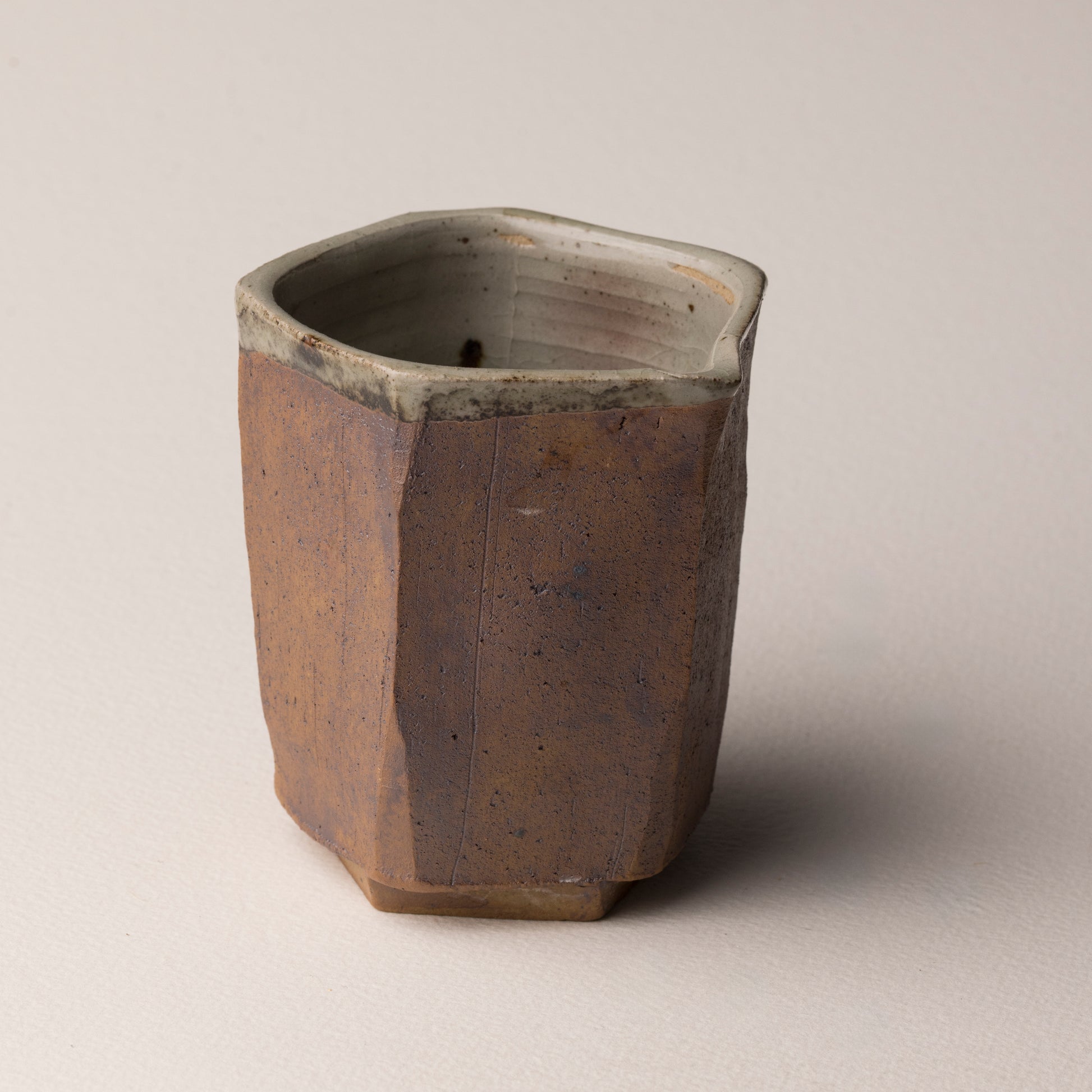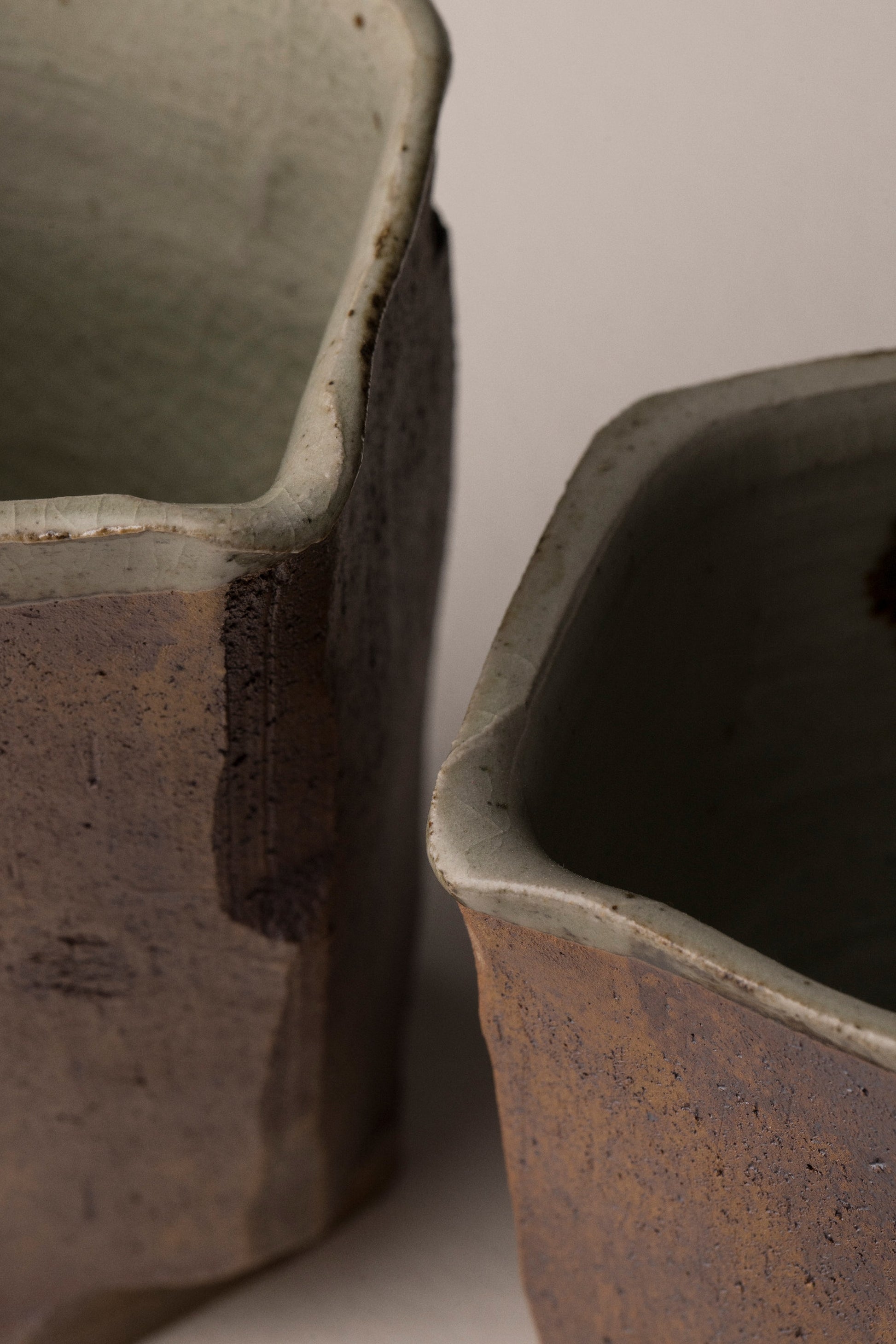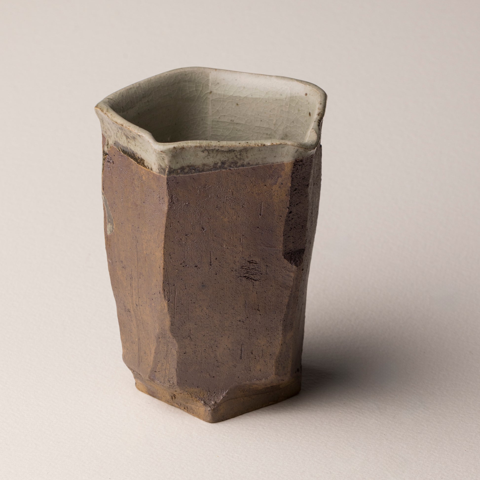 Pichet élancé en grès, aux lignes irrégulières typiques de la série Kakukei. Contraste entre la surface brute et l’émail. Peut servir autant pour l’eau, le vin que comme vase décoratif.
