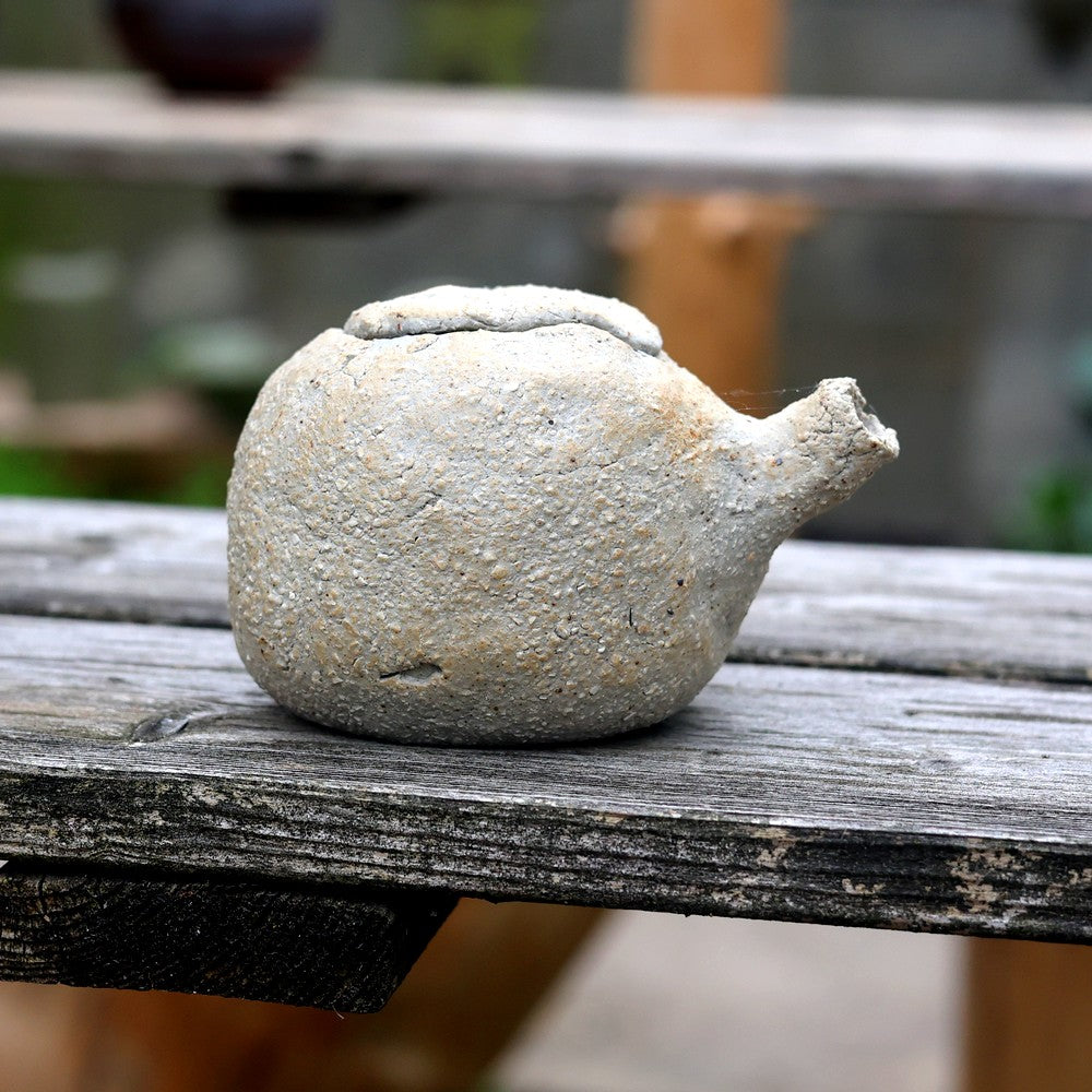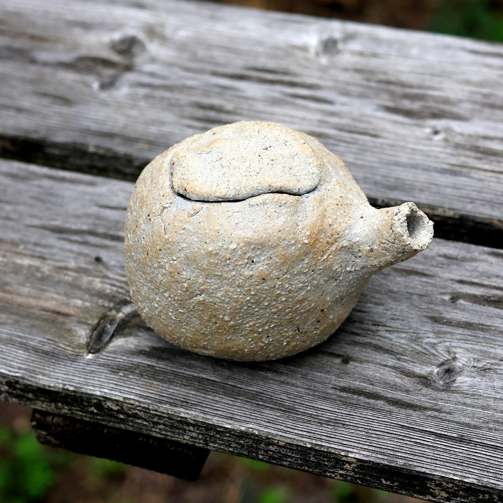 Mini théière artisanale en grès crème, cuisson en réduction à 1280 °C. Pièce unique façonnée à la main. Diamètre 8.6 cm – hauteur 7.5 cm – longueur totale 11.8 cm.