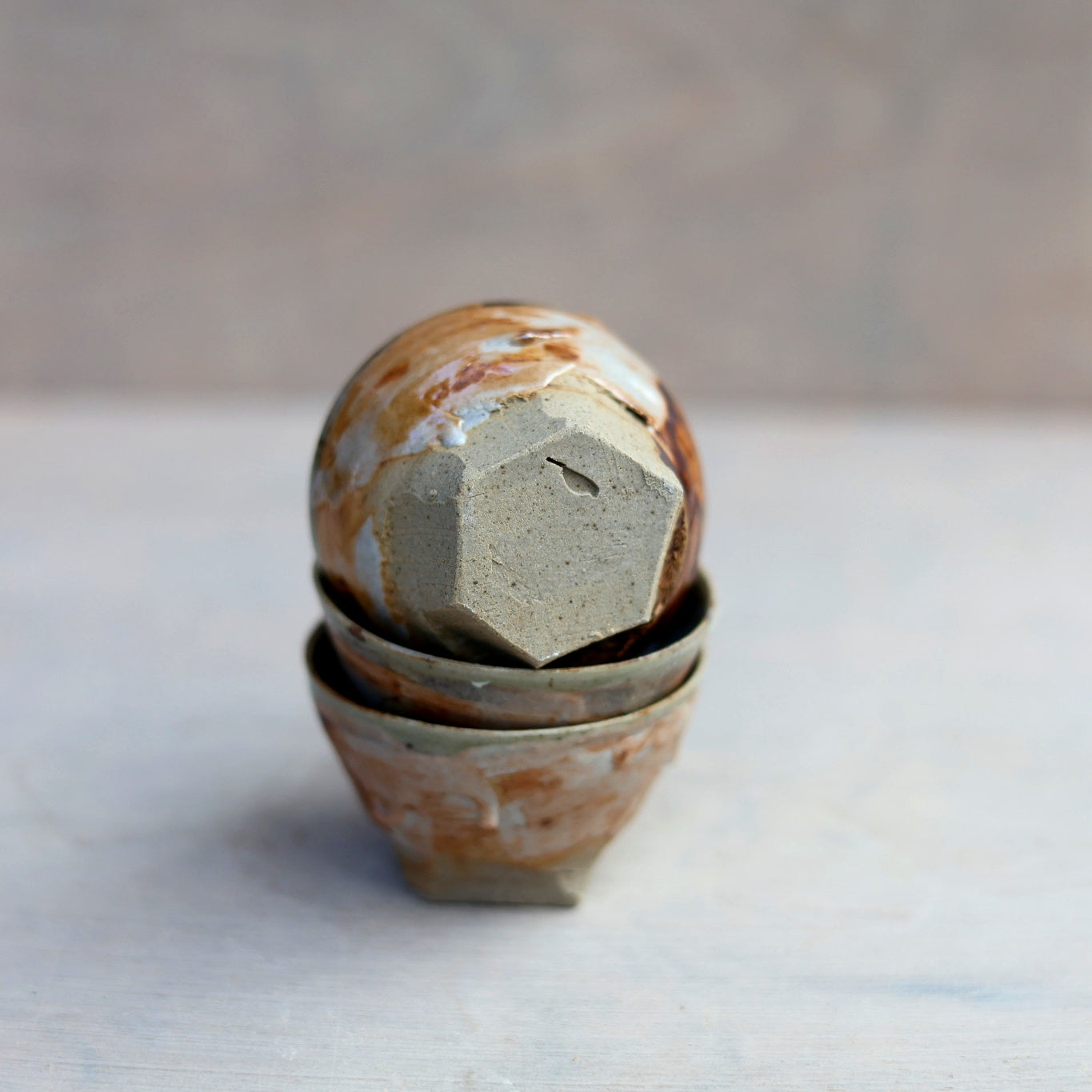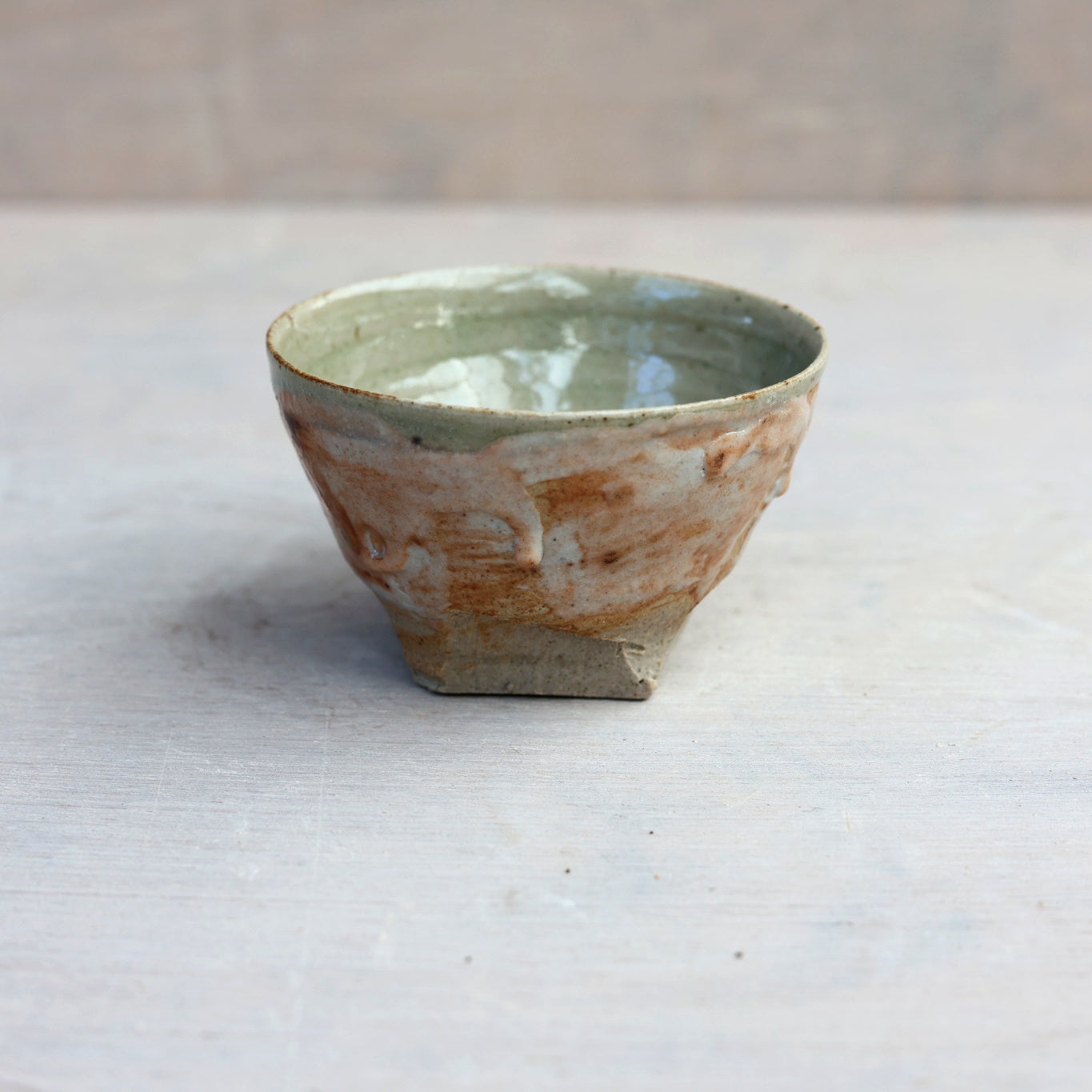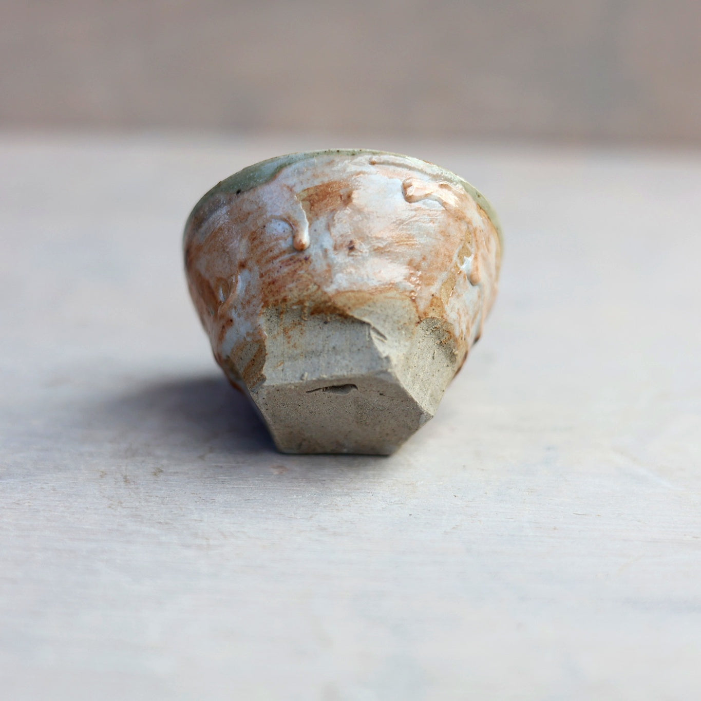 L’extérieur est décoré avec un émail Shino maison, appliqué au pinceau de manière libre, laissant apparaître des variations naturelles, des nuances chaudes et des effets liés à la cuisson.