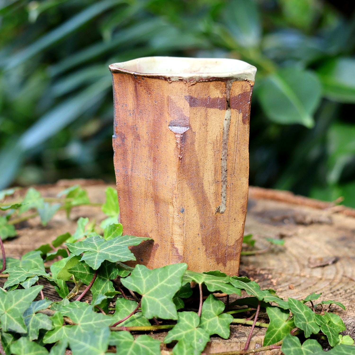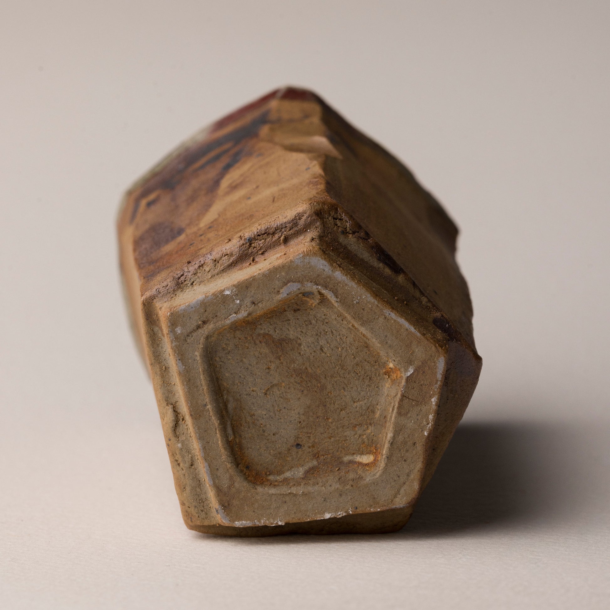 Vase en grès aux formes pentagonales irrégulières, tourné et cuit au gaz. Les coulures d’émail contrastent avec la terre brute. Objet décoratif unique, à la croisée de l’art et de l’artisanat.